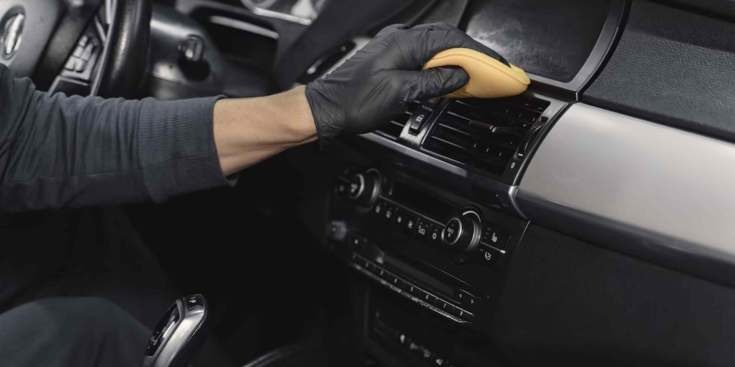 Limpieza en profundidad de salpicadero y consola central, con utilización de brocha en las rejillas de aire y ranuras.